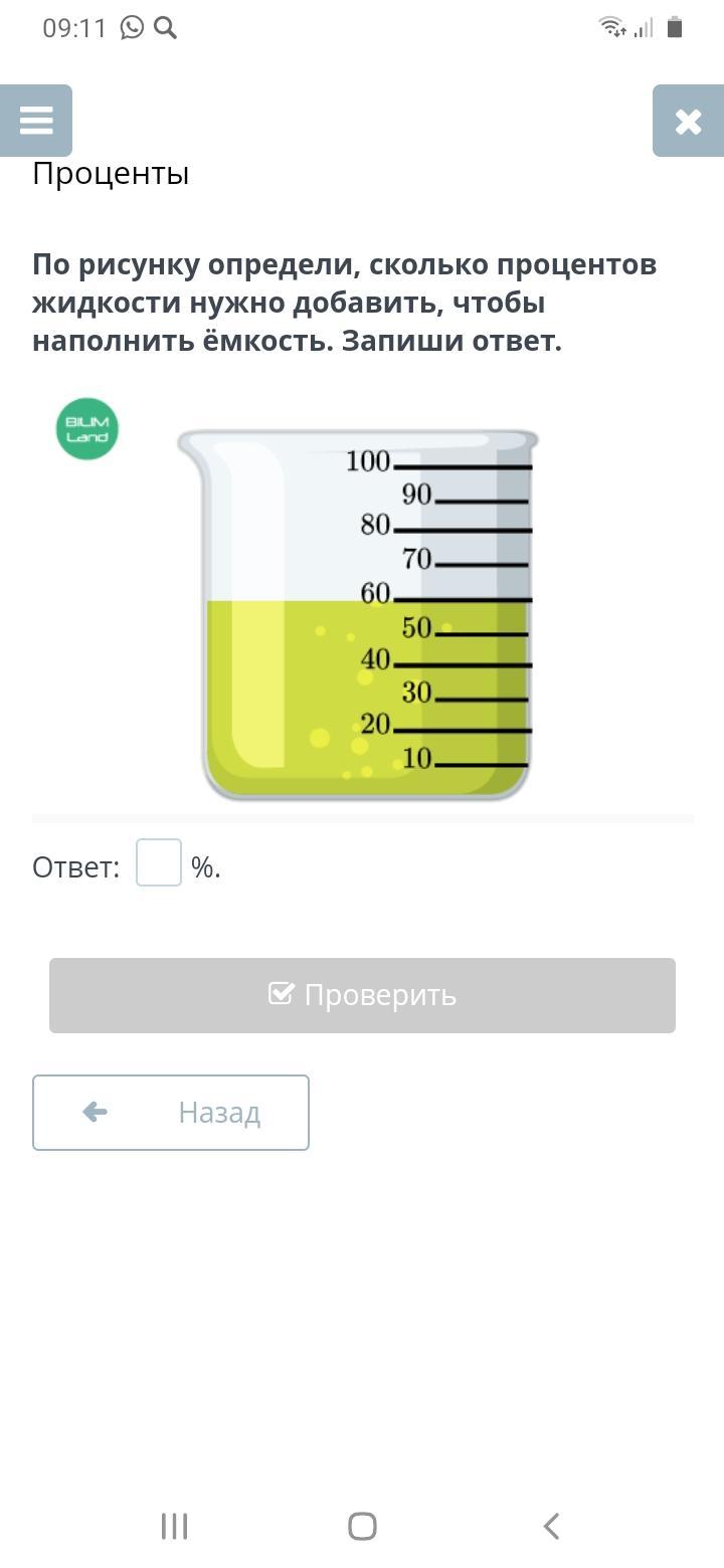 По рисунку определи, сколько процентов жидкости нужно добавить, чтобы наполнить ёмкость. Запиши ответ. Ответ: %.