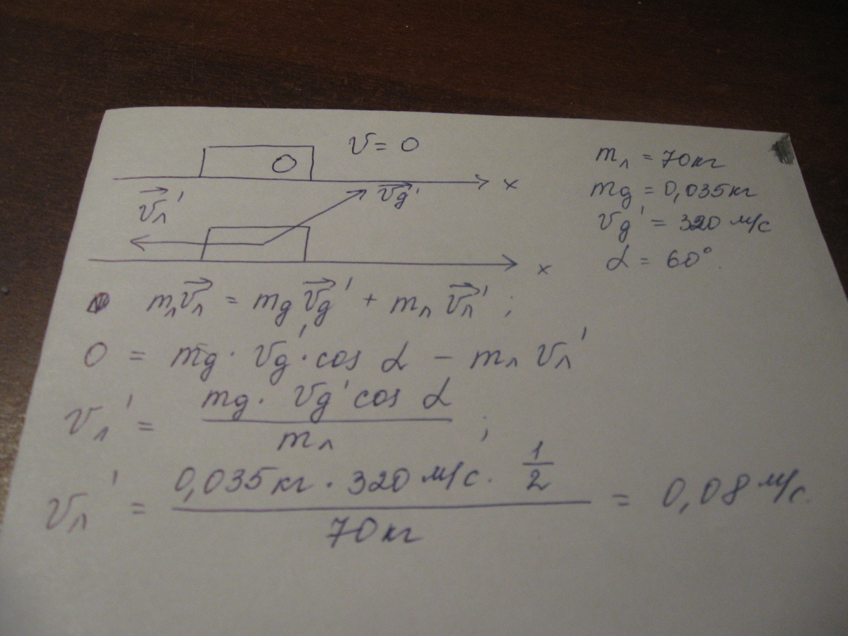Охотник стреляет с легкой надувной лодки. Какую скорость приобретает лодка в момент выстрела, если масса охотника с лодкой равна 70 кг, масса дроби 35 г и средняя начальная скорость дроби 320 м/с? Ствол ружья во время выстрела образует угол 60° к горизонту.