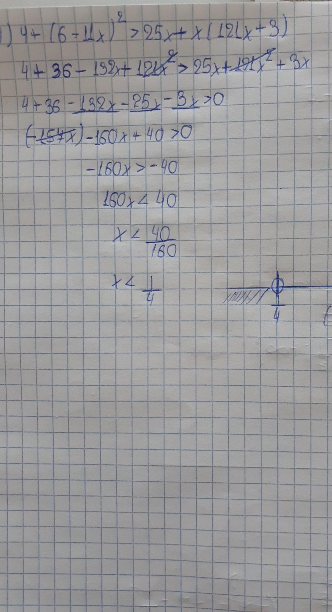 4) 4+ (6 - 11x)^2 > 25x + x(121x + 3)