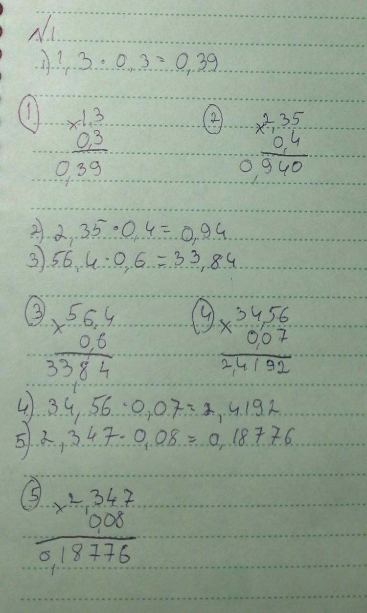 №1. 1) 1,3·0,3; 2) 2,35·0,4; 3) 56,4·0,6; 4) 34,56·0,07; 5) 2,347·0,08.