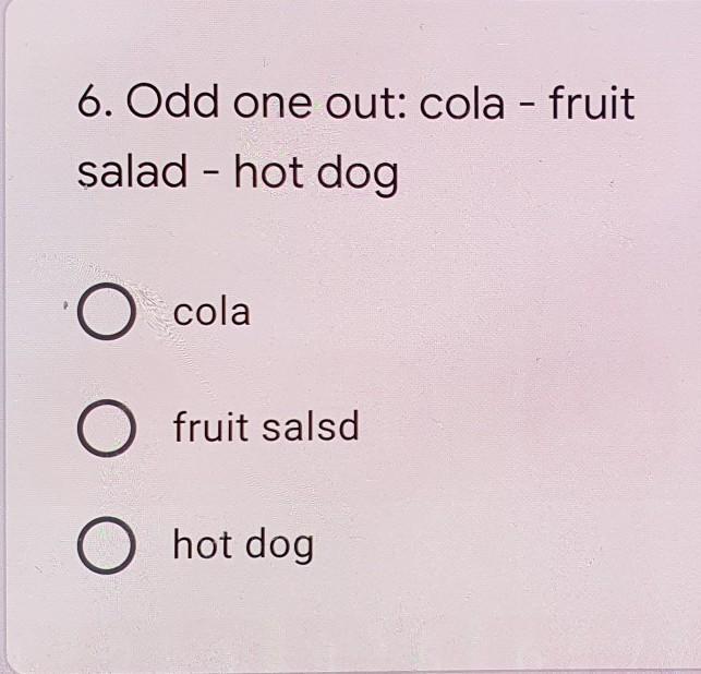 (salad-салат, fruit -фрукт, hot dog- хот дог)