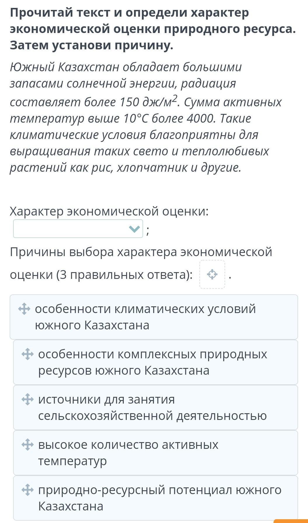 Прочитай текст и определи характер экономической оценки природного ресурса. Затем установи причину.