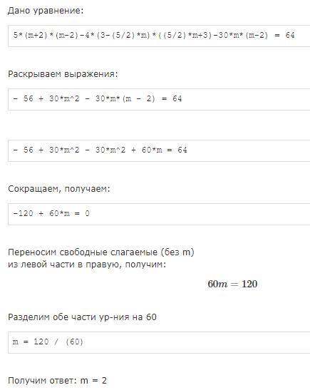 5*(m+2)*(m-2)-4*(3-(5/2)*m)*((5/2)*m+3)-30*m*(m-2) = 64;
