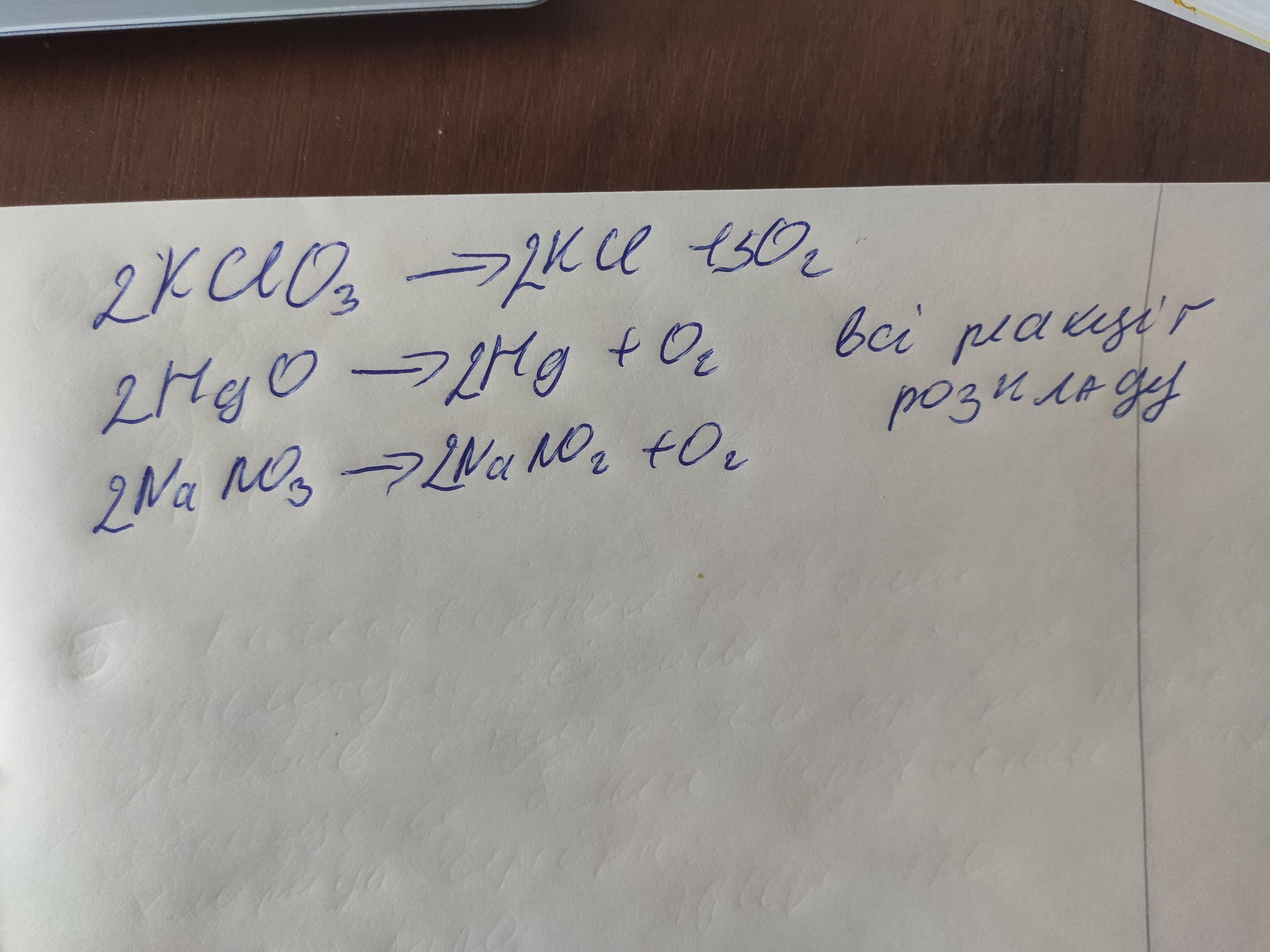 А.Записати рівняння і поставити коефіцієнти: KClO3→ KCl+ O2; HgO→ Hg+ O2; NaNO3→NaNO2+ O2Б. До якого типу належать ці реакції?
