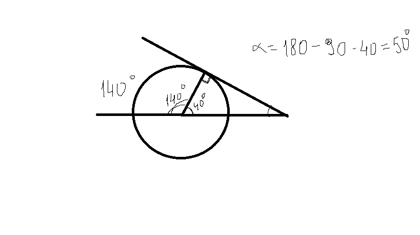 касательная к окружности перпендикулярна отрезку радиуса => составляет угол в 90 градусов. дуга =140 градусам => угол=140 градусам => смежный с ним угол =40 шрадусам