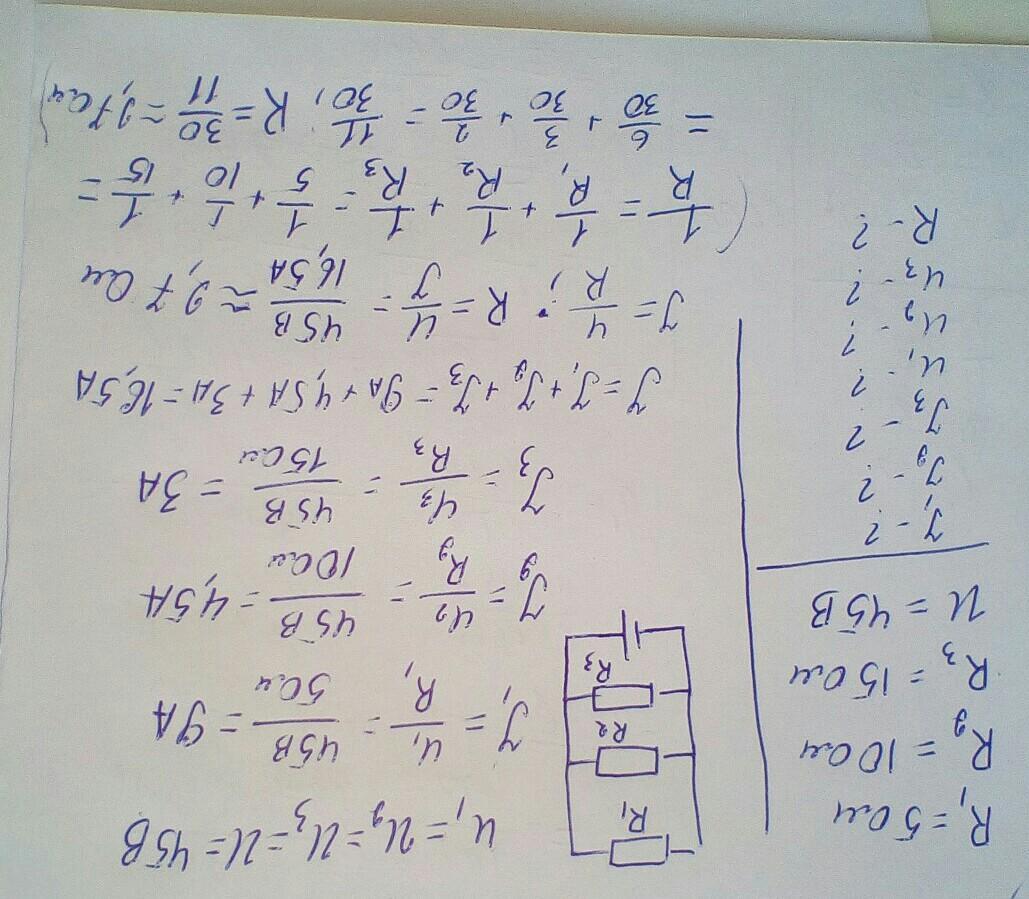 1. К трем параллельно соединенным проводникам сопротивлением 5 Ом, 10 Ом и 15 Ом подали напряжение 45 В. Определите силу тока и напряжение в каждом проводнике. Чему равно общее сопротивление проводников?