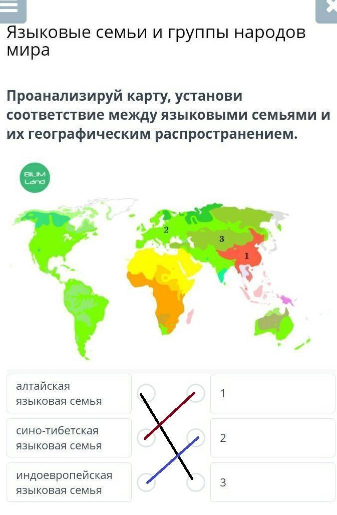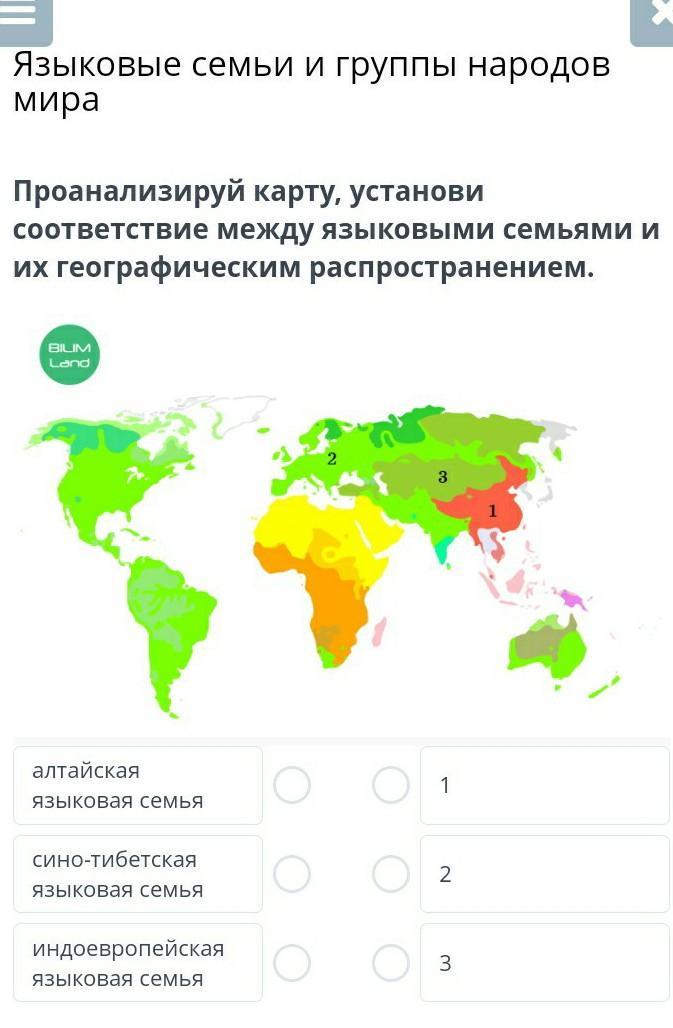 Проанализируй карту, установи соответствие между языковыми семьями и их географическим распространением.