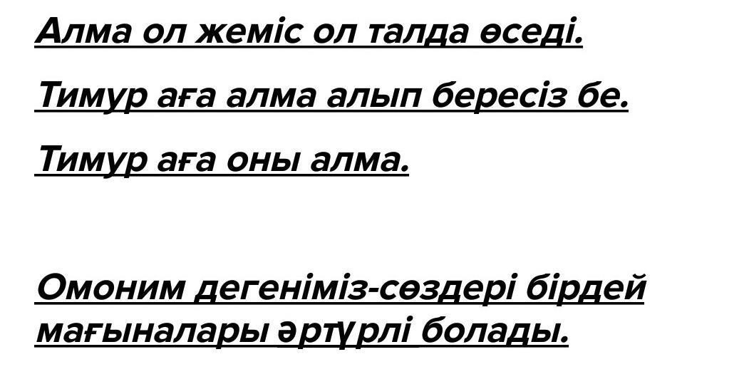 Алма,алмұрт,өрік.Жанар аулада кітап оқып отыр.Ара,гүл,жапырақ,ұшты.Орманда құстардың сайрағаны естіледі.Аю қыста апанына ұйықтайды.Ауыл,көше,дала,қала.