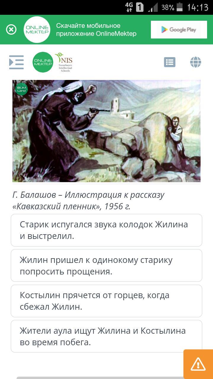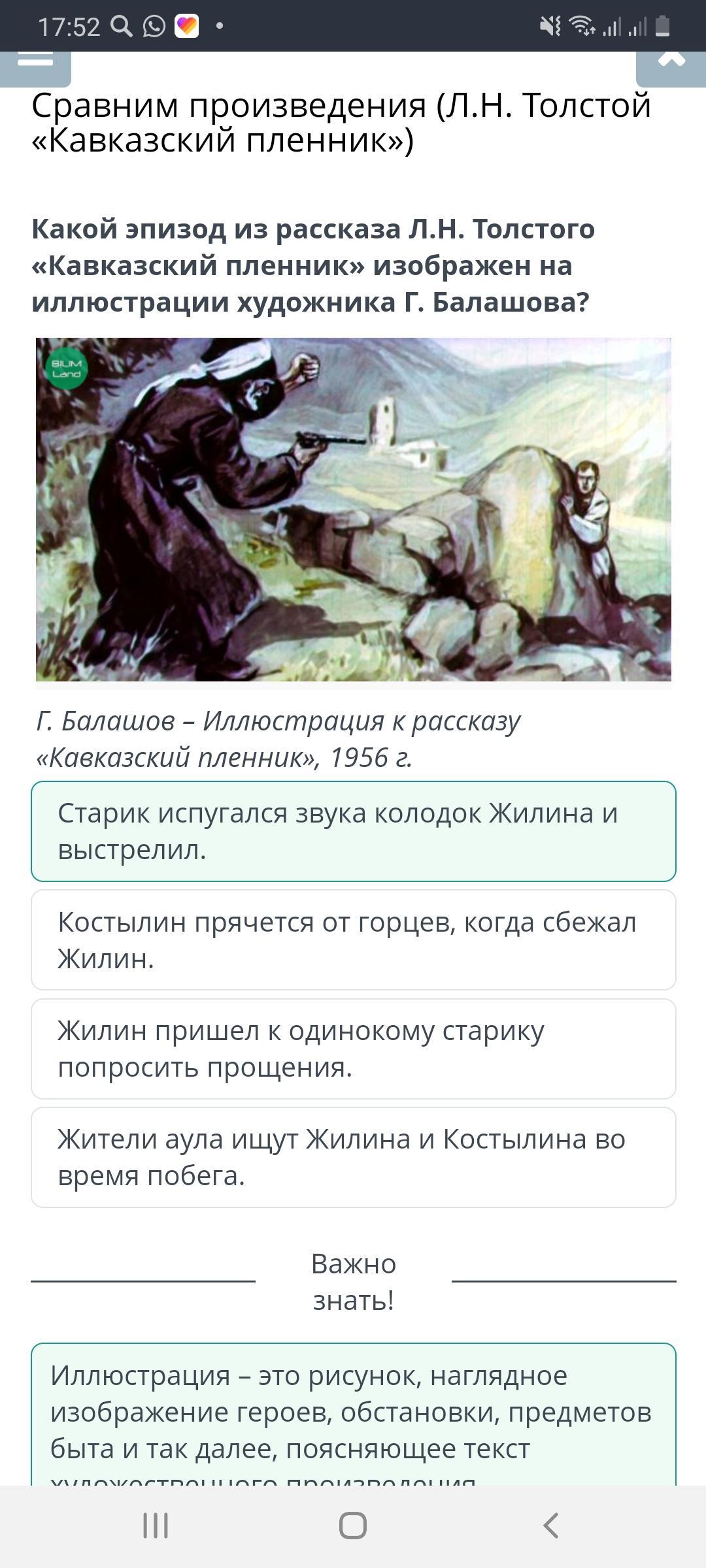 Сравним произведения (Л.Н. Толстой «Кавказский пленник»)Какой эпизод из рассказа Л.Н. Толстого «Кавказский пленник» изображен на иллюстрации художника Г. Балашова?Г. Балашов – Иллюстрация к рассказу «Кавказский пленник», 1956 г.Старик испугался звука колодок Жилина и выстрелил.Жилин пришел к одинокому старику попросить прощения.Костылин прячется от горцев, когда сбежал Жилин.Жители аула ищут Жилина и Костылина во время побега