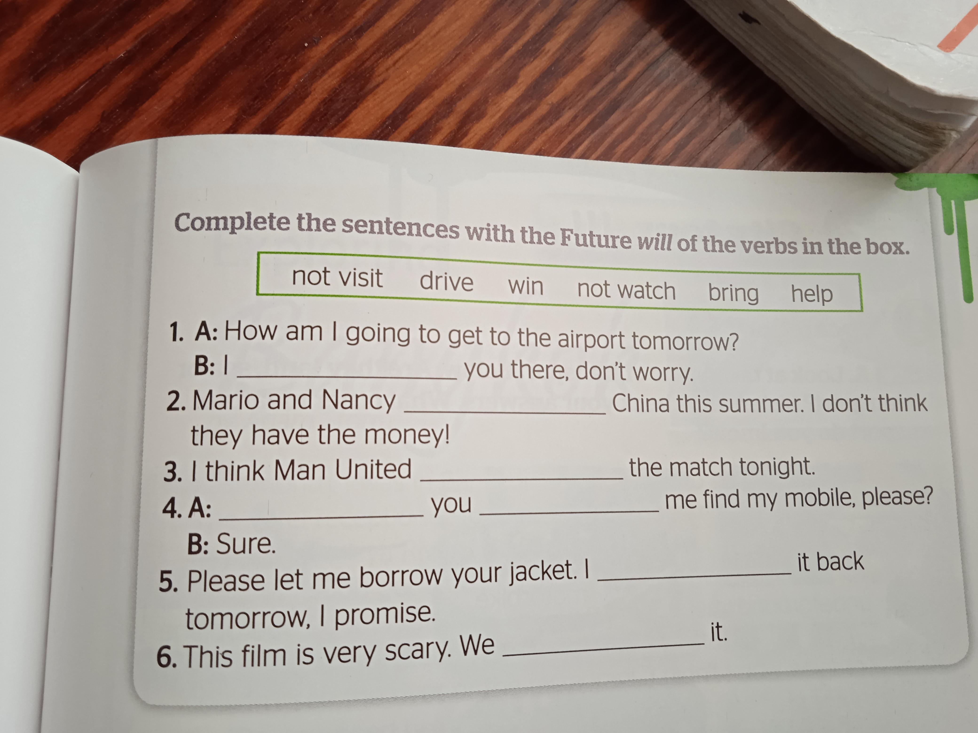 1) will drive: 2)will not visit: 3) will win: 4) Will - help: 5)will bring: 6)Will not watch