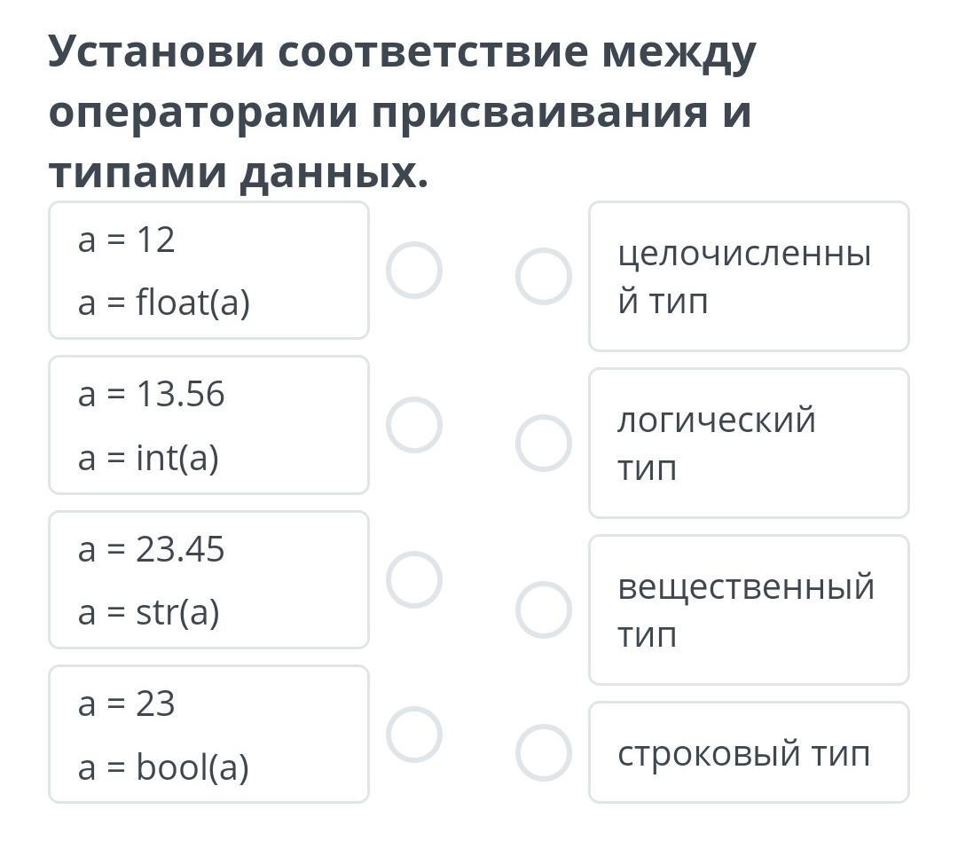 Установи соответствие между операторами присваивания и типами данных