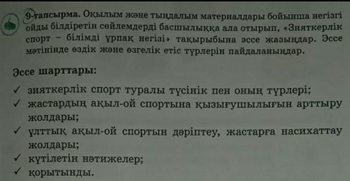 9-тапсырма. Оқылым және тыңдалым материалдары бойынша негізі ойды білдіретін сөйлемдерді басшылық ала отырып, "Зияткерлік спорт - білімді ұрпақ негізі" тақырыбына эссе жазыңдар. Эссе мәтінінде өздік және өзгелік етіс түрлерін пайдаланыңдар. пж пж пж пж пж пж. балл беремін
