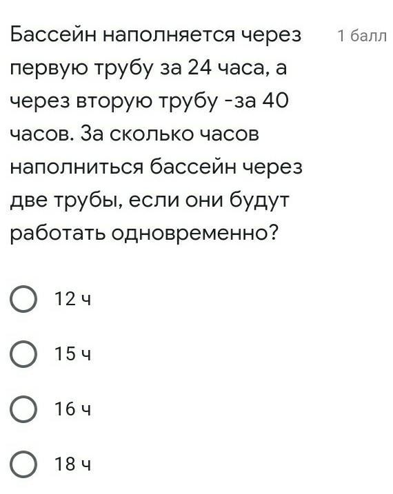 Бассейн наполняется через первую трубу за 24 часа, а через вторую трубу -за 40 часов. За сколько часов наполниться бассейн через две трубы, если они будут работать одновременно?