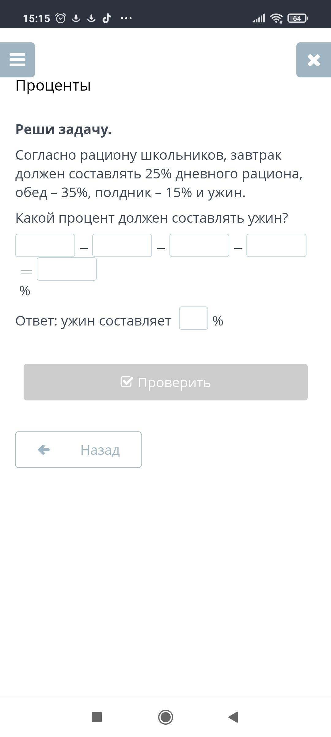 Согласно рациону школьников, завтрак должен составлять 25% дневного рациона, обед – 35%, полдник – 15% и ужин.