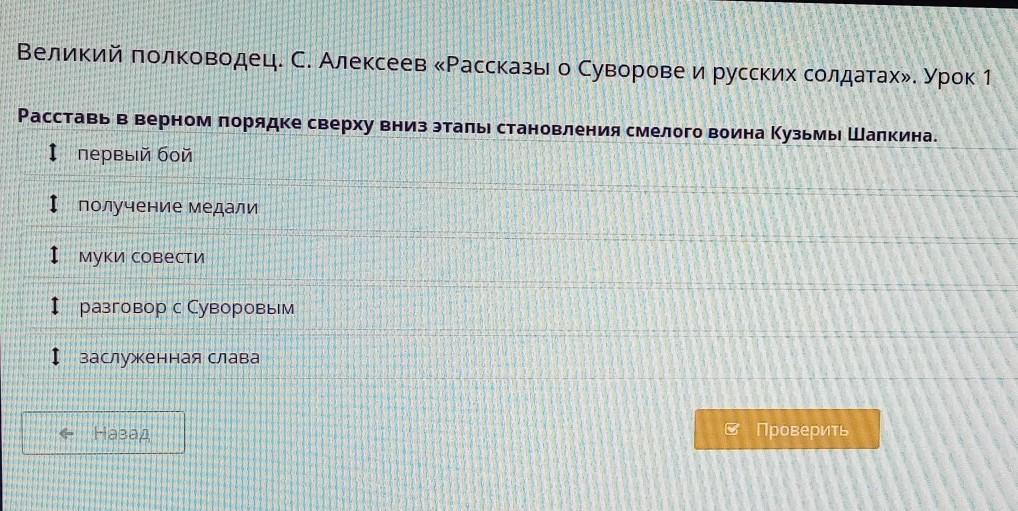 Расставь в верном порядке сверху вниз этапы становления смелого воина Кузьмы Шапкина.