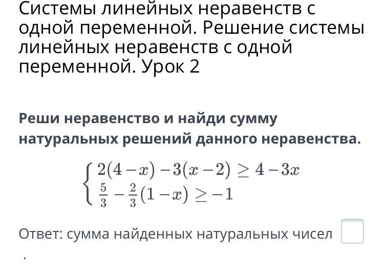 {5/3 - 2/3× (1-х) ≥ -1. = { 5/3 - 2/3 + 2/3х ≥ -1 = 2/3х ≥ -1 - 5/3 + 2/3 = 2/3х ≥ 2 = х ≥ 3