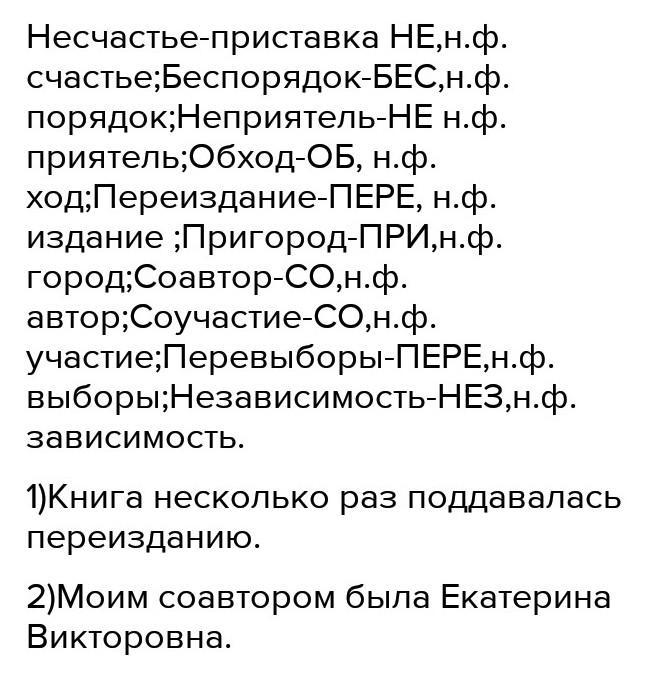 Беспорядок,неприятель,несчастье,обход,переиздание,пригород,соавтор,соучастие,перевыборы,независимость.