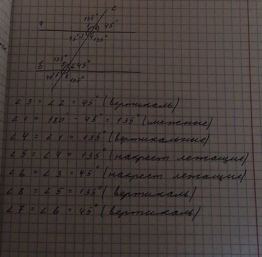 Две параллельные прямые пересечены секущей и один угол равен 45 градусов. Найти остальные углы.