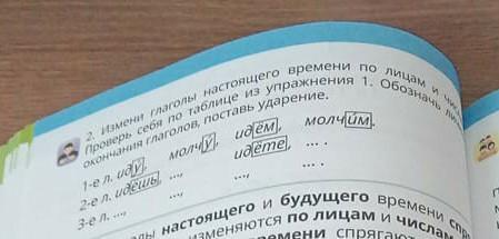 измени глаголы настащего времени по лицам.Проверь себя по таблице 1 упражнения.Обозначь оканчания глаголов поставь ударение