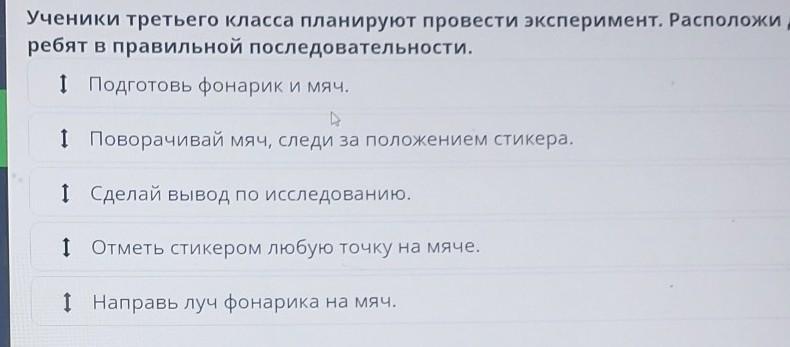Ученики третьего класса планируют провести эксперимент.Расположи действия ребят в правильной последовательности.