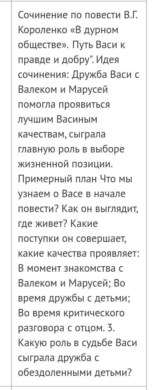 В своей повести «В дурном обществе» В.Г. Короленко показывает, как под воздействием чрезвычайных обстоятельств формируется личность главного героя повести мальчика Васи, сына местного судьи. Со знакомства с «дурным обществом» начинается для главного героя путь к добру и правде.