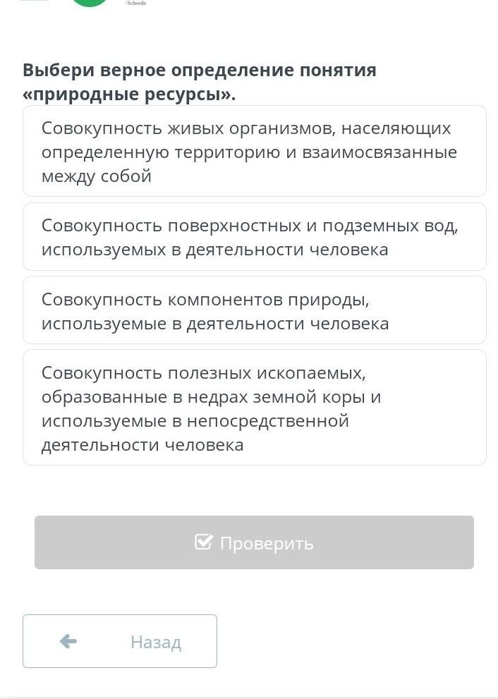- Верное определение понятия «природные ресурсы».Совокупность компонентов природы, используемые в деятельности человека