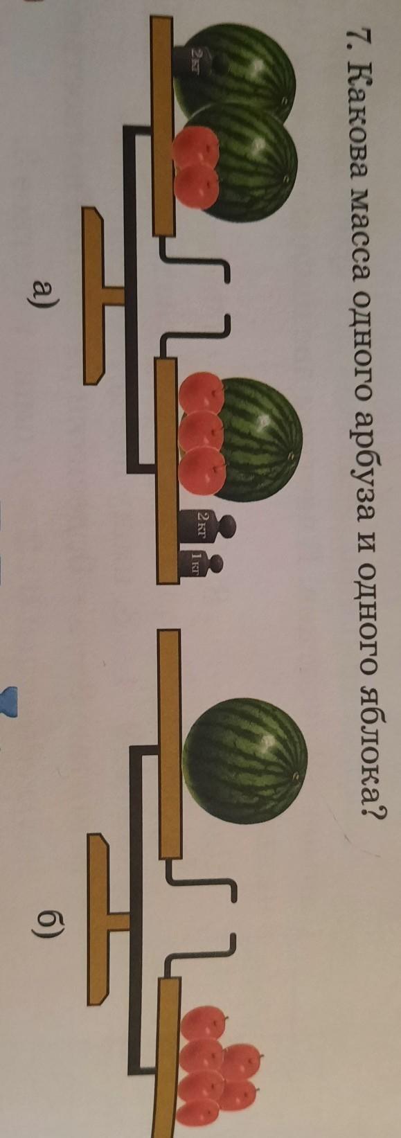 на 2 рисунке арбуз = 6 яблокам, но мы знаем, что арбуз = 1 кг и яблоко