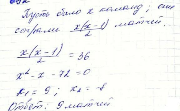 В футбольном турнире было сыграно 36 матчей.Сколько команд участвовало в турнире,если каждая команда сыграла по одному разу с каждой из остальных команд?