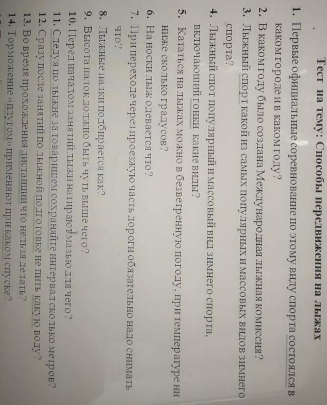 Закрепление различных способов передвижения на лыжах. 2. Закрепление техники передвижения на лыжах. 3. Выработка умения анализировать и делать выводы. Лыжный спорт – один из самых популярных и массовых видов зимнего спорта. В середине XVIII в. Скандинавских странах стали проводиться лыжные гонки. Первые официальные соревнования по этому виду спорта состоялись в Норвегии в 1767 году. В конце XVIII начале XX в. В разных странах мира стали создаваться лыжные клубы. В 1910году была создана Международная лыжная комиссия, а в 1924 году – Международная федерация лыжного спорта . Наша федерация вступила в нее в 1948 году. Лыжный спорт — популярный и массовый вид зимнего спорта, включающий гонки, прыжки с трамплина, биатлон, слалом, горные лыжи и скоростной спуск, северное двоеборье (гонки и прыжки с трамплина), фристайл (балет, акробатика, могул), а также лыжную подготовку как первую ступень занятий лыжным спортом. Лыжники - Герои олимпиады Мы гордимся нашими выдающимися лыжниками — чемпионами мира и Олимпийских игр: В. Кузиным, Н. Зимятовым, П. Колчиным, В. Ведениным, А. Прокуроровым, Л. Козыревой, Г. Кулаковой, Р. Сметаниной, Е. Вяльбе, Л. Егоровой, О. Даниловой и многими другими. Техника безопасности Кататься на лыжах можно в безветренную погоду, при температуре не ниже -14*С, при слабом ветре – не ниже -12*С. При переходе через проезжую часть дороги обязательно надо снимать лыжи. При спуске с горы палки следует держать сзади концами вниз. При потере равновесия надо падать на бок, не подставляя рук. При переноске лыж в транспорте (дороге).лыжи должны быть связаны в трех местах, (сверху, снизу и за середину палки крепятся к лыжам, кольцами вниз). На носки лыж одевается мешок. Или лыжи переносятся в чехле. Соблюдать дисциплину, всегда видеть и слышать учителя, так как подача команд, указаний и распоряжений производится при низкой температуре и их повторения должны быть сведены до минимума. Следуя по лыжне за товарищем, сохраняйте интервал 3—4 м, а при спуске с горы не менее 30 м. При спуске с горы не останавливайтесь у ее подножия, таккак на вас может наехать спускающийся следом лыжник. Лыжи и палки должны быть подобраны по росту . Сразу после занятий по лыжной подготовке не пить холодную воду, чтобы не заболело горло. Никогда не растирайте обмороженные участки тела снегом. Лыжные ботинки должны быть подобраны по размеру: тесная или очень свободная обувь может привести к потертостям или травме голеностопного сустава. Одежда, обувь, лыжный инвентарь Лыжи и палки подбираются по росту. Длина лыж должна быть такой, чтобы можно было достать пальцами вытянутой вверх руки до конца поставленной вертикально лыжи. Высота палок должна быть чуть выше подмышек. Палки должны быть легкими, эластичными и прочными. Перед началом занятий лыжи натирают мазью для лучшего скольжения. Мазь выбирают в зависимости от температуры воздуха. Для хранения и переноски используются специальные колодки. Ходьба на лыжах При ходьбе на лыжах в работу вовлекается наибольшее, по сравнению с другими видами упражнений, число мышц, основательно нагружаются мышцы ног, рук, спины, живота. В процессе занятий совершенствуются жизненно важные качества — воля, смелость, выносливость, скоростно-силовые способности. Основные правила соревнований Никогда не срезать дистанции. Если вас догнал соперник, уступите 