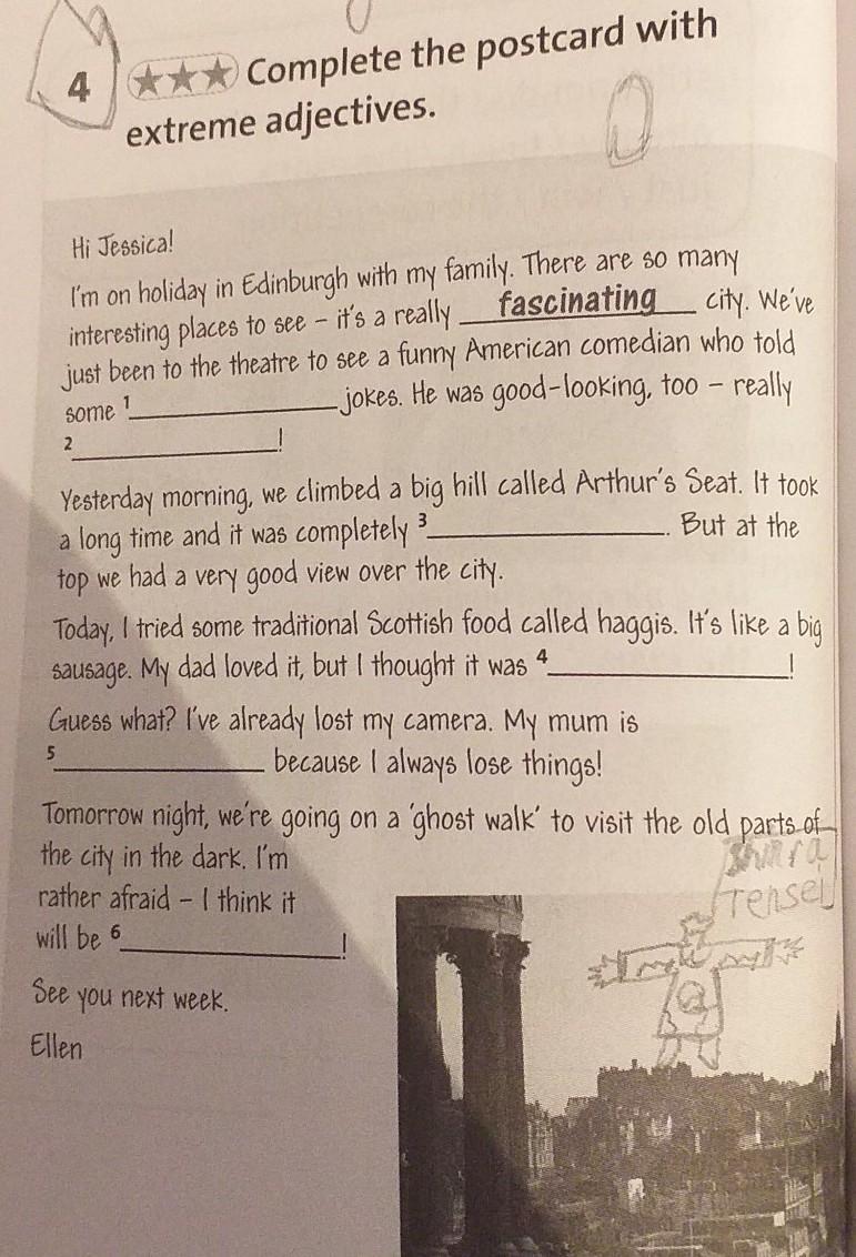 1) hilarious, 2) gorgeous, 3) terrible, 4) disgusting, 5) furious, 6) perilous