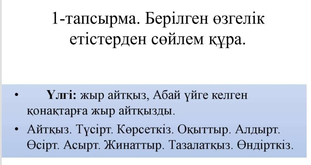 Жыр айтқыз.Абай үйге келген қонақтарға жыр айтқызды.Түсірт.Абайдың жылдың төрт мезгілінде арналған өлеңдерін еске түсірту.Оқыттыр.Абай балаларын мұсылманша оқыттырды.Алдырт.Абай Дәркембайдың 30 малын алдыртты.Жинаттыр.Абай туралы шығарма жинаттыру.