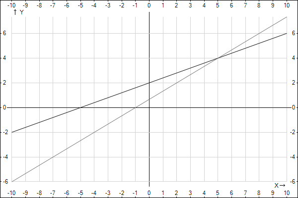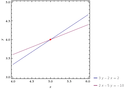 Получаем графики как на рисунке во вложении. Две прямые пересекаются в одной точке. Координаты точки пересечения есть решение ситемы: (5;4)