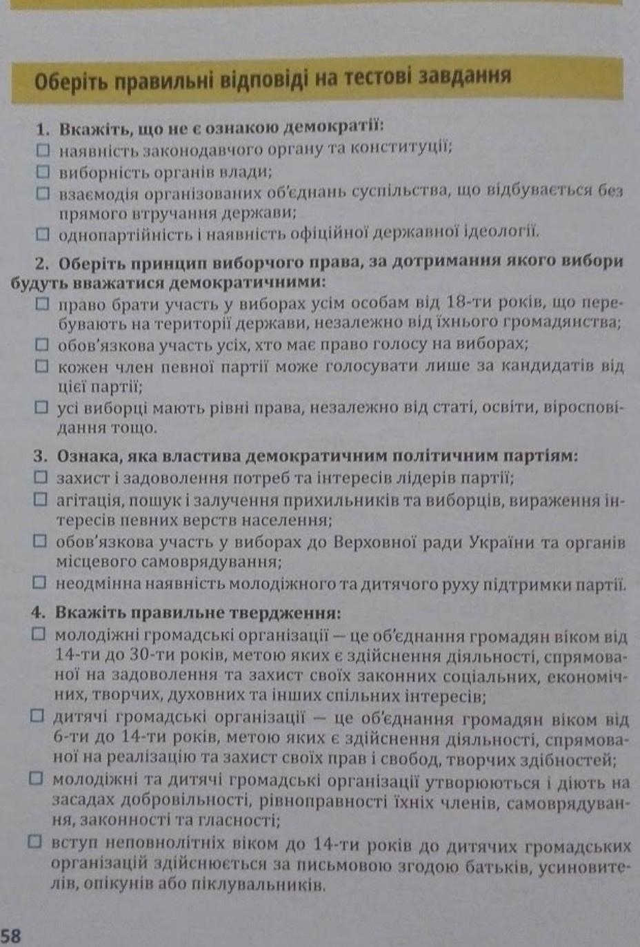 питання 4 молодіжні та дитячі громадські організації діють на засадах добровільності, рівноправності їх членів (тобто варіант відповіді 3) (ст.3 Закону України "Про молодіжні та дитячі громадські організації) , а от щодо інших варіантів відповідей, то згідно вимог Закону України "Про молодіжні та дитячі громадські організації": у першому варіанті відповіді що таке молодіжні організації невірно вказаний вік від 14 до 30 - замість від 14 до 35 (ст.2 Закону), у варіанті 2 знову ж таки невірно вказаний вік- від 6 до 14, замість від 6 до 18 років (ст. 2 Закону), у варіанті відповіді 4 для вступу неповнолітніх до 10 років (а не 14, як вказано) потрібна письмова згода батьків, опікунів (ст. 5 Закону).