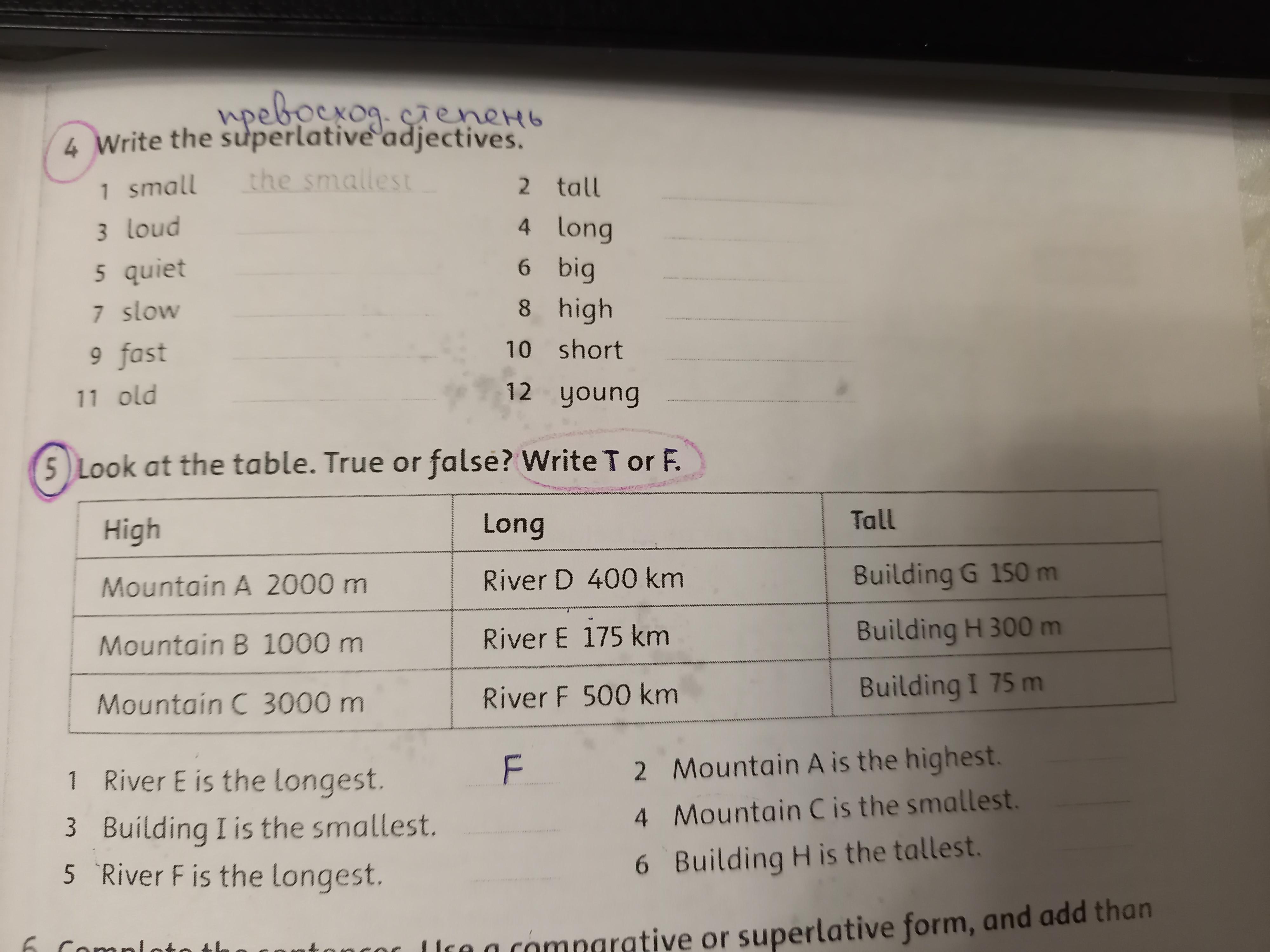 5. 1)F 2)F 3)T 4)F 5)T 6)T 4. 1)the smallest 2)tallest 3)loudest 4)longest 5)quietest 6)biggest 7)slowest 8)highest 9)fastest 10)oldest 11)youngest