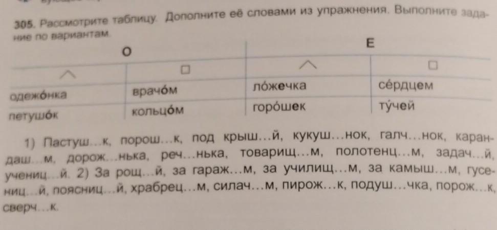 Пастушок 1,порошок 1,под крышей 4,кукушонок 1, галчонок1,карандашом 2,дороженька3,реченька3,товарищем 4,полотенцем4,задачей 4,ученицей4, . За рощей4,за гаражом2,за училищем4,за камышом2,гусеницей4,поясницей4,храбрецом2,силачом2,пирожок1,подушечка3,порожек 3,сверчок1.