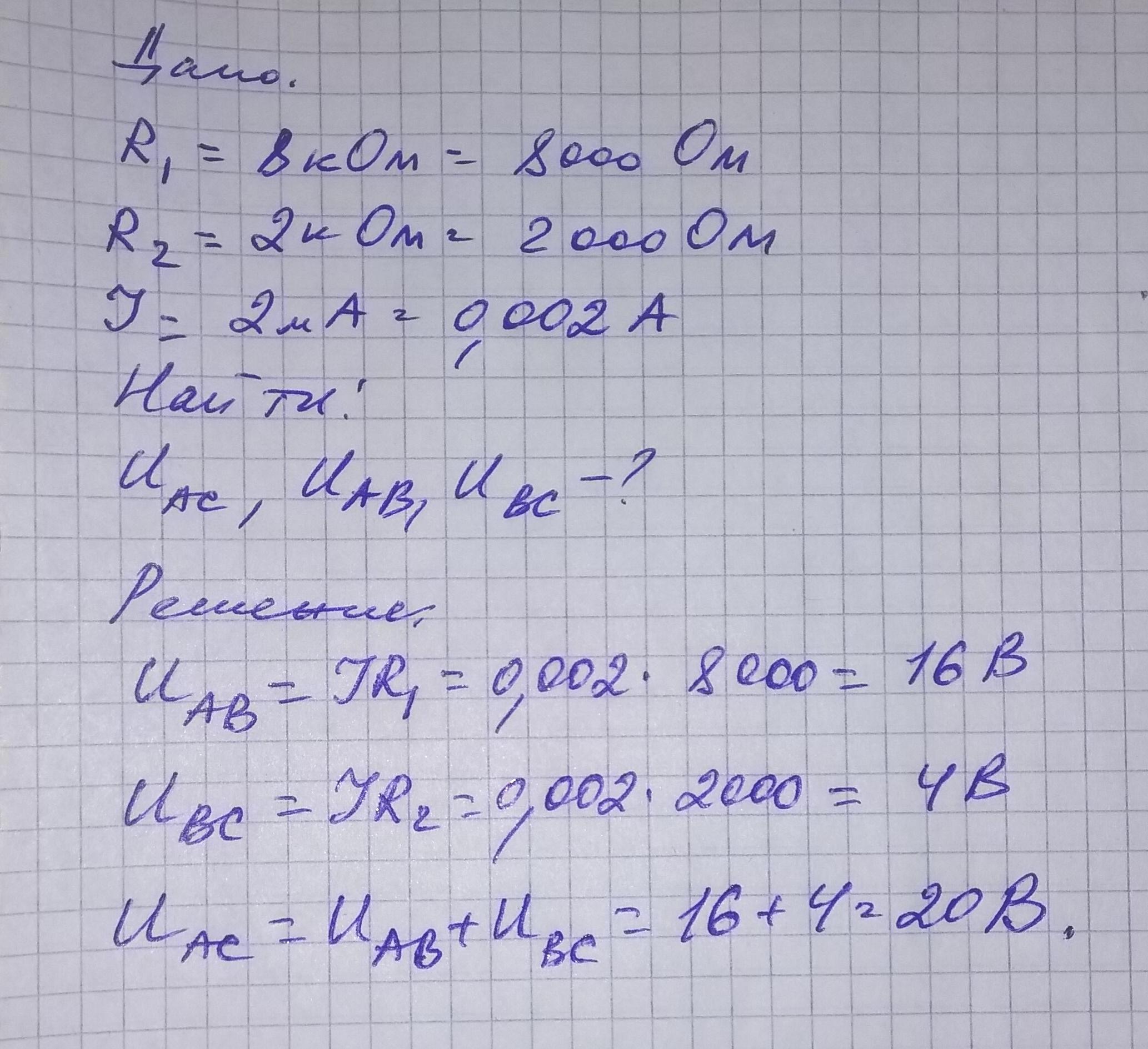На рисунке изображена схема с двумя последовательно соединенными резисторами R1 = 8 кОм и R2 = 2 кОм сила тока в цепи 2мА. Определите показания вольтметра подключенного к точкам A и C, A и B, B и C.