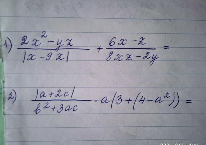 1: (2*x**2-y*z)/(abs(x-9*x)) + (6*x-z)/(8*x*z-2*y)