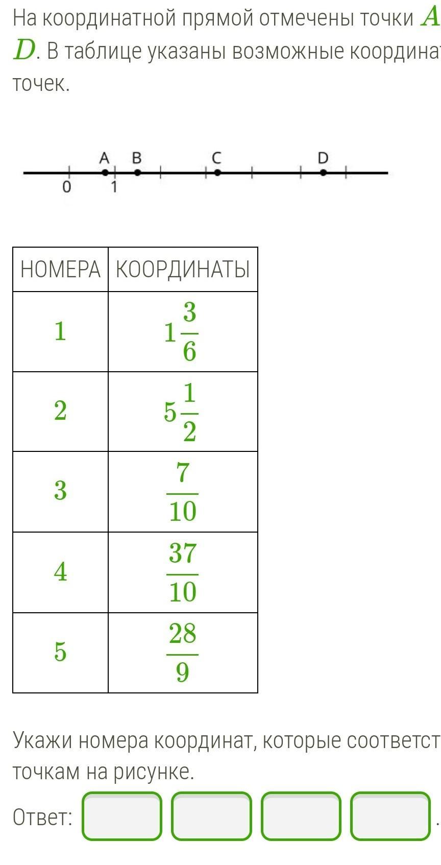 На координатной прямой отмечены точки A, B, C, D. В таблице указаны возможные координаты точек.