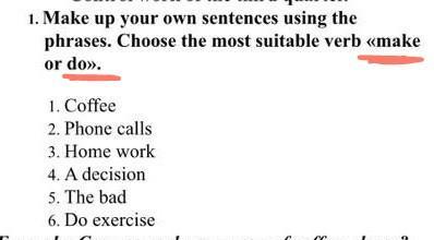 1. my granny makes tasty coffee. 2 my aunt is a secretary. she makes a lot of calls every day. 3 I dont like doing my home work 4 you should make right decission 5 he made me do bad stuff in the woods I like doing exercises every morning