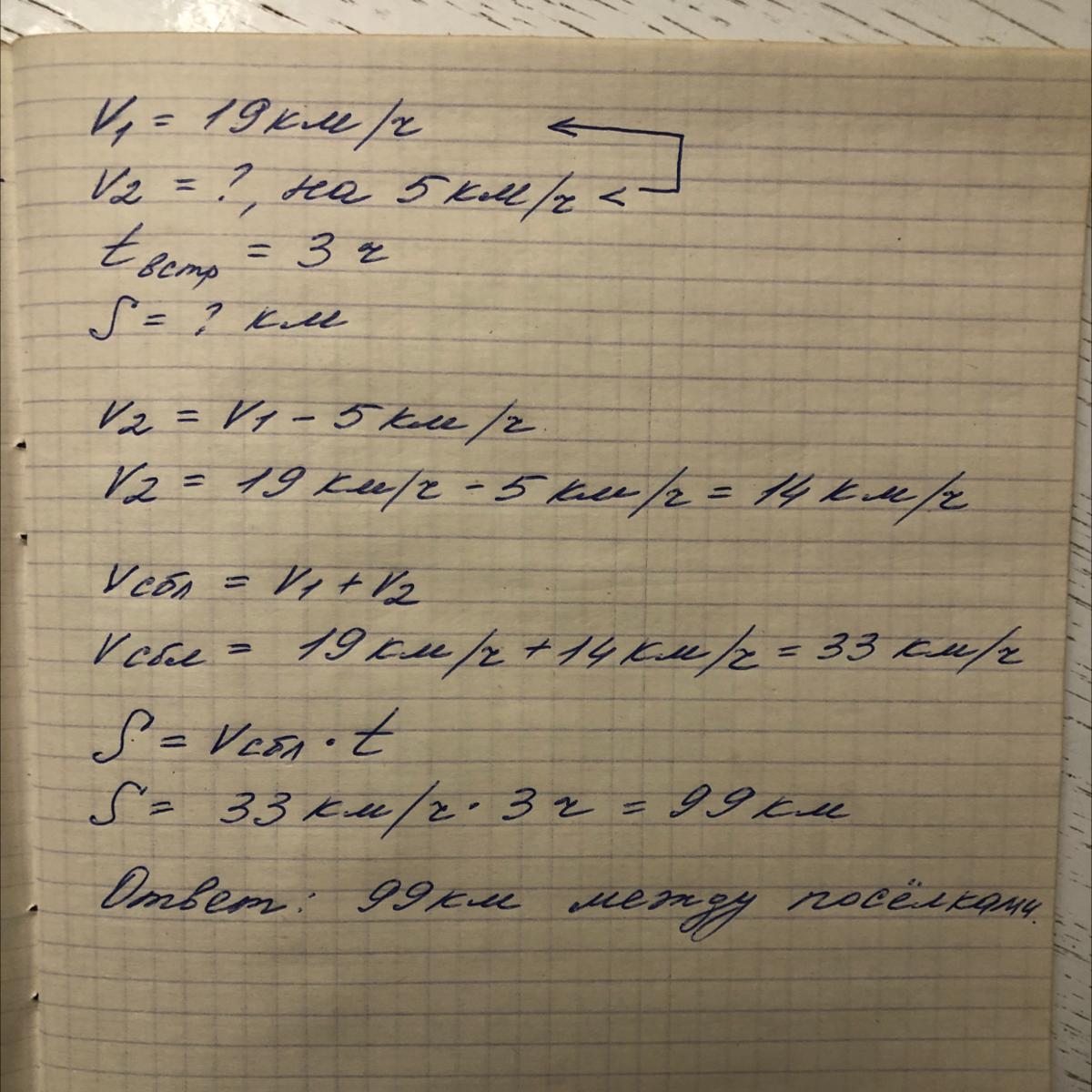 из двух поселков навстречу друг другу выехали два велосипедиста скорость одного 19 км/ч а скорость другого на 5 км/ч медленее. встретились они через 3 часа. чему равно расстояние между поселками