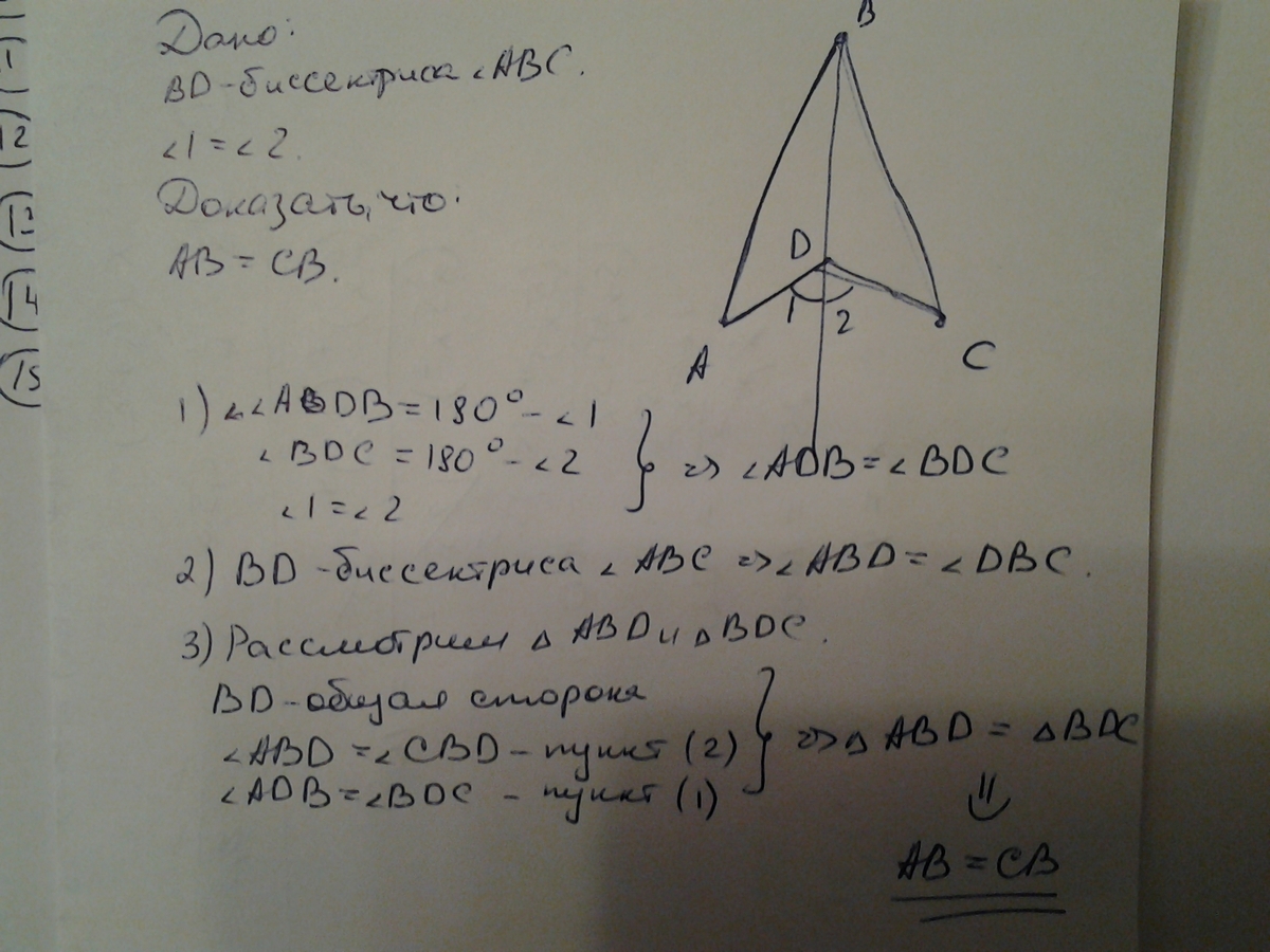 сторона ВД общая, углы АВД и СВД равны, так как ВД биссектриса, если угол 1 равен углу 2, то и смежные с ними углы равны, то есть угол АДВ равен углу СдВ