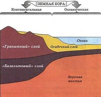 Материковая кора состоит из осадочного, гранитного и базальтового слоя.