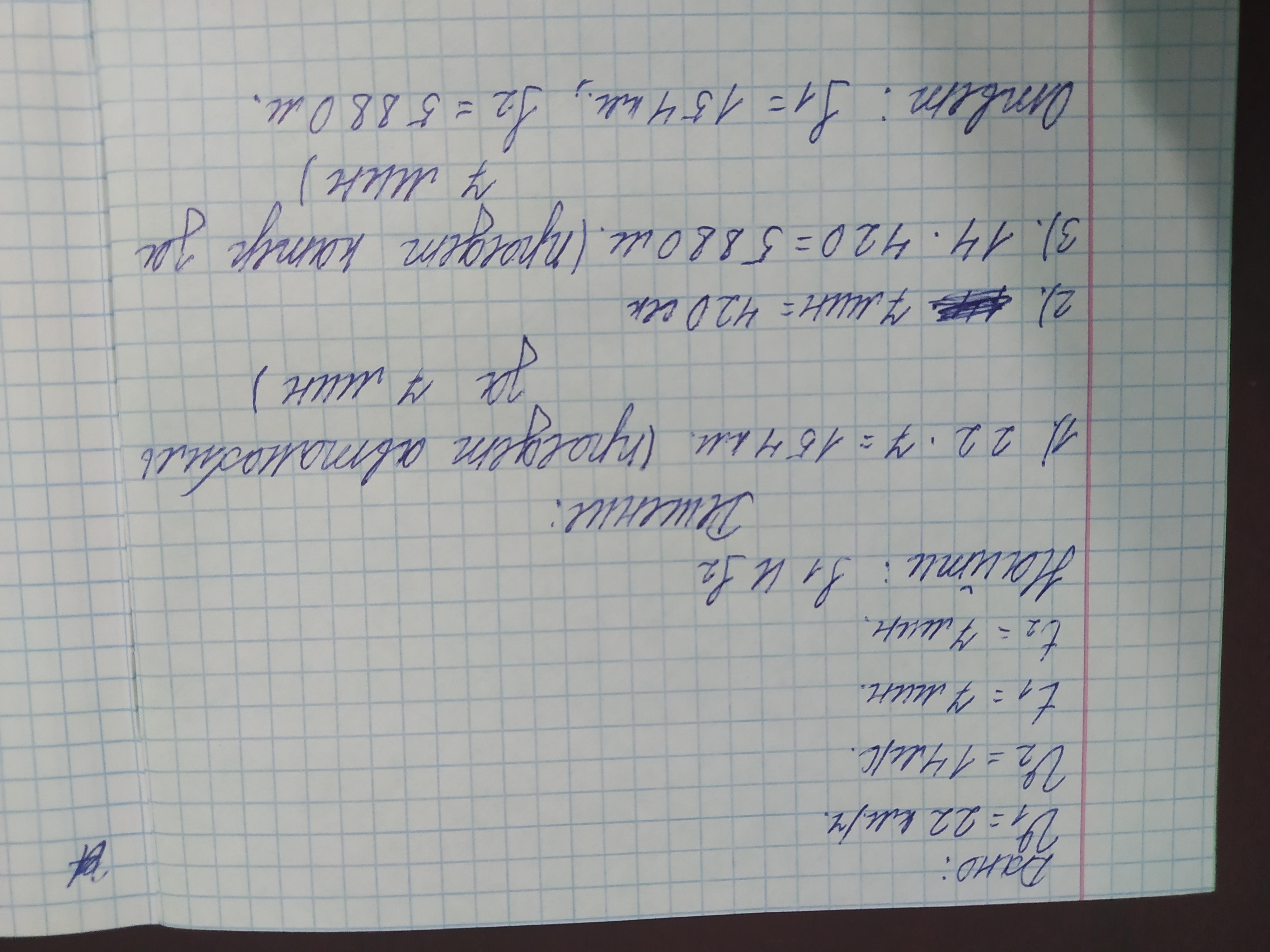 Автомобиль двигался со скоростью 22 км/ч, а катер 14 м/с. Какое расстояние прошел каждый из них за 7 минут?