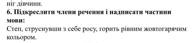 Степ(**підмет, іменник**), струснувши(**присудок, дієслово**) з себе росу (**додаток**), горить (**присудок, дієслово**) рівним жовтогарячим (**означення**) кольором(**додаток**).
