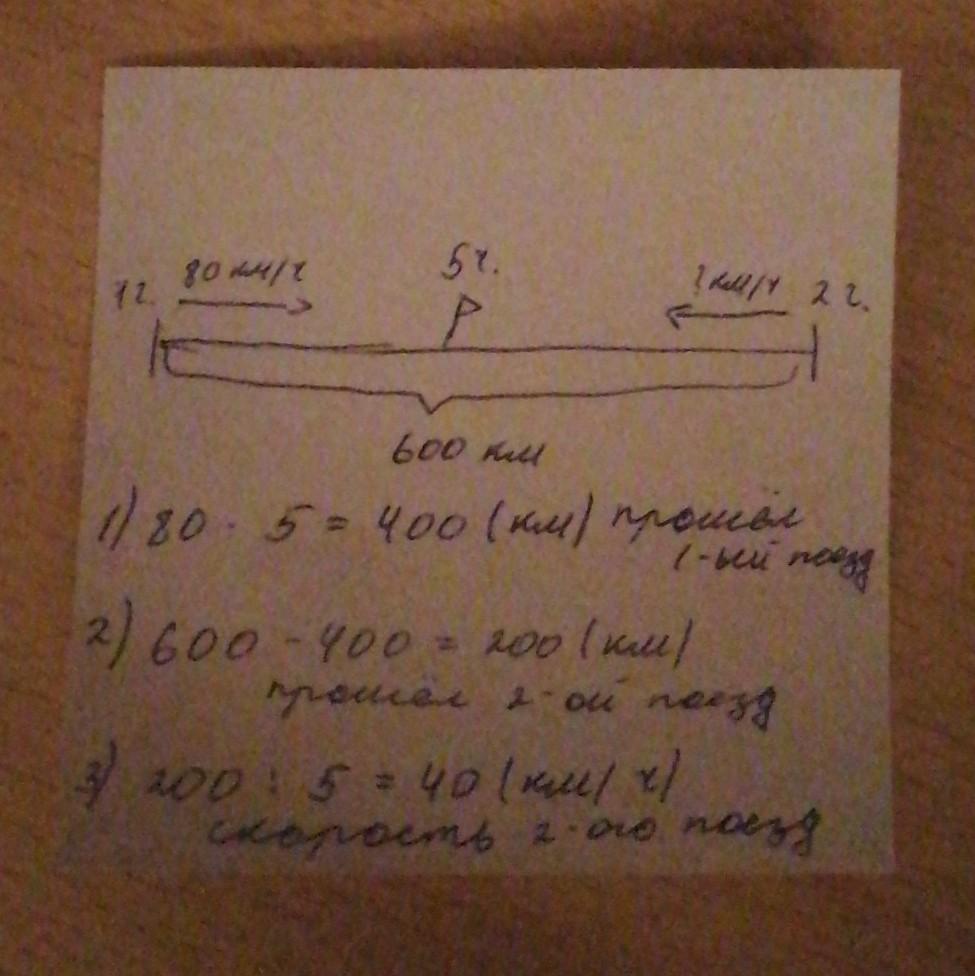 из двух городов расстояние между которыми 600км,одновременно навстречу друг другу вышли 2 поезда и встретились через 5 часов.один поезд шел со скоростью 80км/час. с какой скоростью шел 2й поезд? помогите ОЧЕНЬ СРОЧНО!!! Заранее спасибо