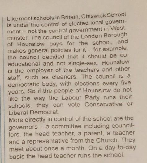 Как и большинство школ в Великобритании, Чизвикская школа находится под контролем выборного правительства, а не центрального правительства в Вестминстере. Совет лондонского района Хаунслоу платит за школу и составляет общую политику для нее - например, совет решил, что она должна быть совместным образованием, а не однополым Хаунслоу является работодателем учителей и другого персонала, такого как уборщицы. Совет является демократическим органом, выборы в который проводятся каждые пять лет.Поэтому, если жителям Хаунслоу не нравится, как Лейбористская партия управляет их школами, они могут голосовать за консерваторов или Либерал-демократов. Более непосредственно в ведении школы находятся губернаторы - комитет, включающий советников, завуча, родителя, учителя и представителя Церкви. Они встречаются примерно раз в месяц. На ежедневной основе директор школы руководит школой