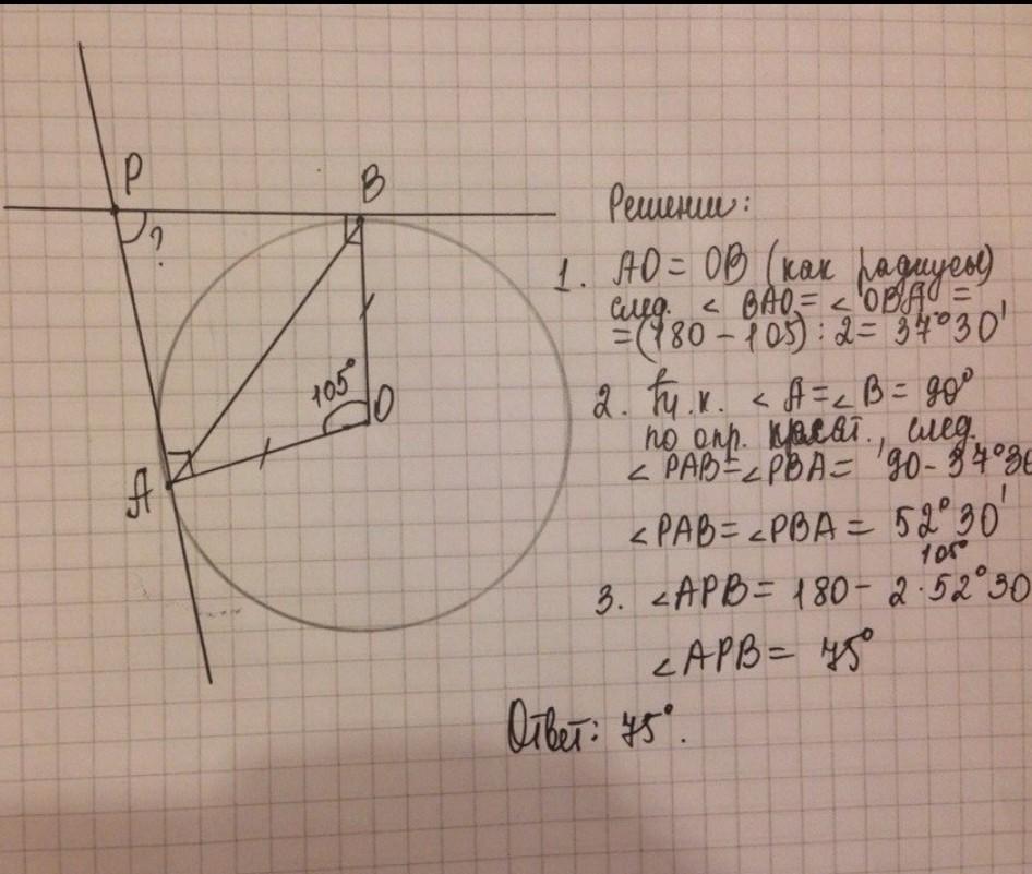 В окружности с центром в точке О проведена хорда АВ. Через точки А и В проведены касательные к окружности, пересекающиеся в точке Р. Найдите градусную меру угла АОВ.