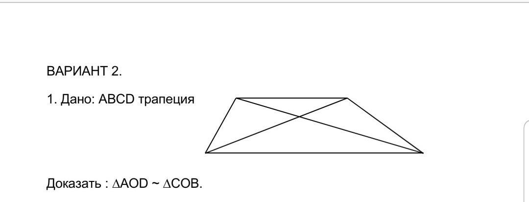 Углы СОВ и АОД равны, как вертикальные. Углы ОВС и ОДА равны , как внутренние накрестлежащие при параллельных ВС и АД, следовательно треугольники подобны по двум углам.