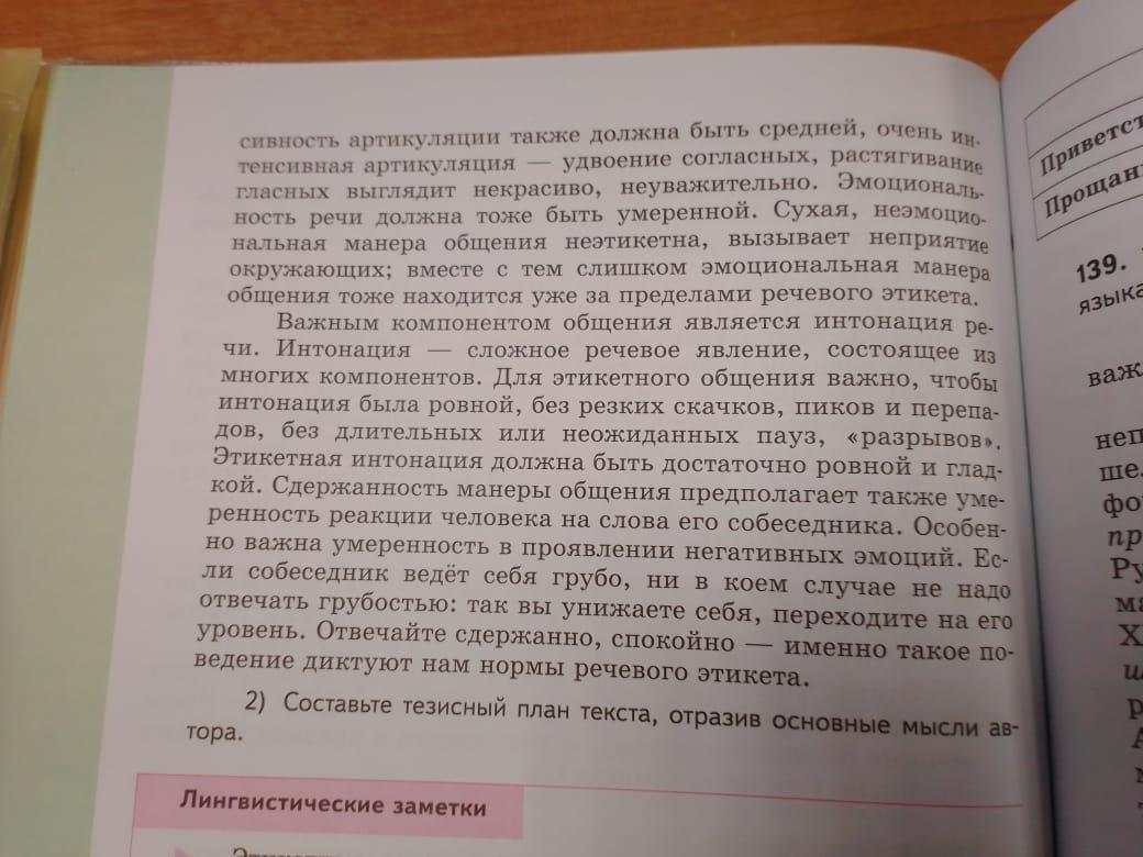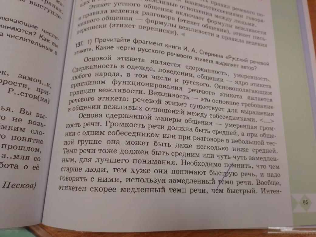 1.) Автор выделяет черты русского речевого этикета: сдержанность (в громкости, темпе, интенсивности артикуляции, эмоциональности речи, умеренности реакции человека на собеседника), этикетная интонация, вежливость.