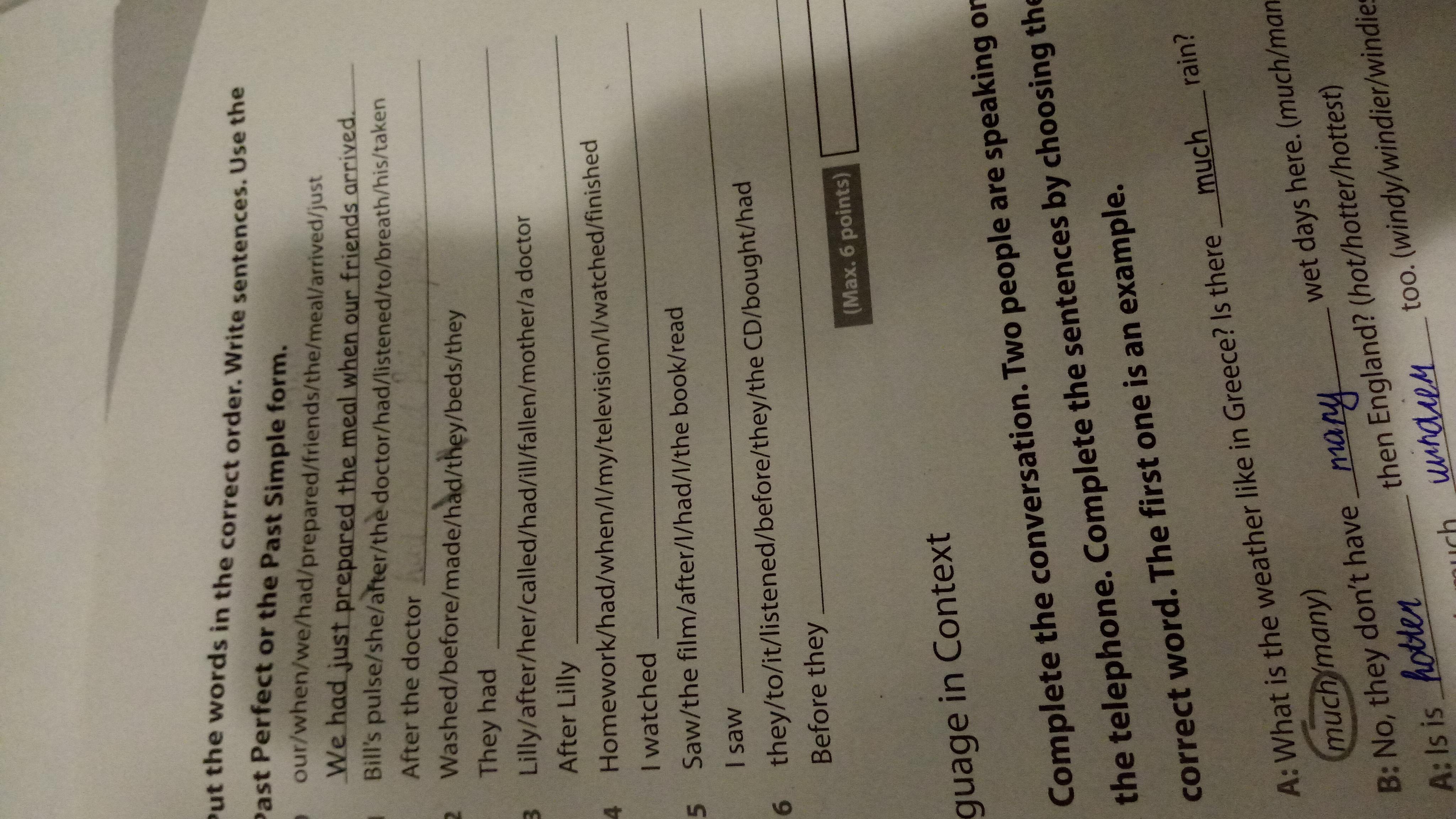 1 had taken Bill's pulse she listened to his breath. 2. made beds before they washed 3.had fallen ill her mother called a doctor.4 television when I had finished my homework. 5 the film after I had read the book. 6 bought the cd they had listened to it
